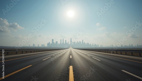 Fototapeta premium Empty highway leading to a distant hazy city skyline under a bright sun,...