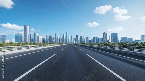 © Berkah, Obraz premium Empty Highway Leading to a Modern City Skyline on a Clear Sunny Day
