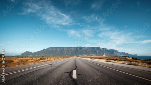 Fototapeta premium Empty highway leading to flat topped mountain under blue sky with wispy clouds