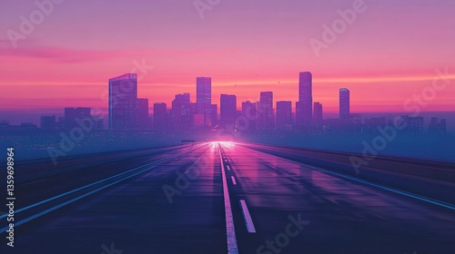 Fototapeta premium Empty highway merging into a distant cityscape, sleek buildings rising under a soft twilight gradient, clean asphalt stretching endlessly