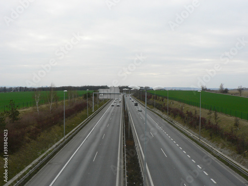 © Yuliya, Fototapeta premium Empty highway on a cloudy day. A speeding car. View over the two-way road with two lanes in each direction. Green field along the road, autobahn or highway.