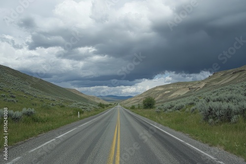 Fototapeta premium Empty highway stretches into a cloudy sky over rolling hills