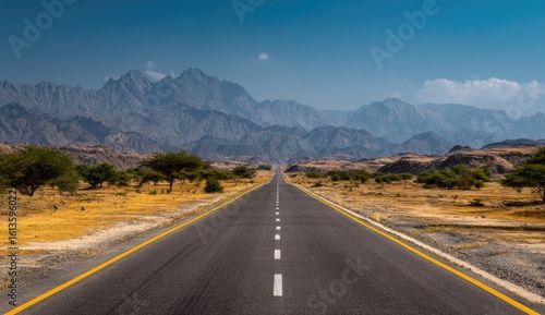 © Pisang, Fototapeta premium Empty highway stretches into a mountain range under a clear sky