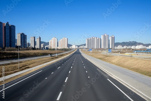 © tolem929, Obraz premium Empty highway through city, clear blue sky