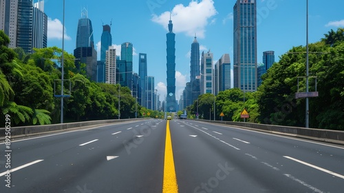 © Whitecatz, Fototapeta premium Empty highway with futuristic high-tech buildings, modern urban landscape, bright blue sky, horizontal perspective