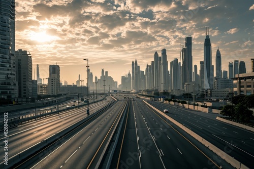 Fototapeta premium Empty highways and urban skylines, A photo of Empty asphalt road and modern...