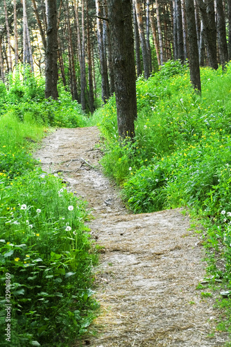 © Rozaliya, Fototapeta premium Empty hiking trail with green fresh grass and trees in spring pa