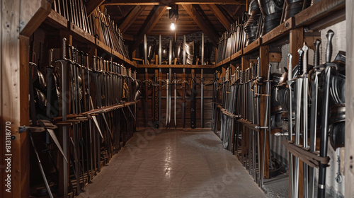 © Muhammad, Fototapeta premium Empty historical weapons storage shed with racks for swords and armor, all meticulously preserved but unused.