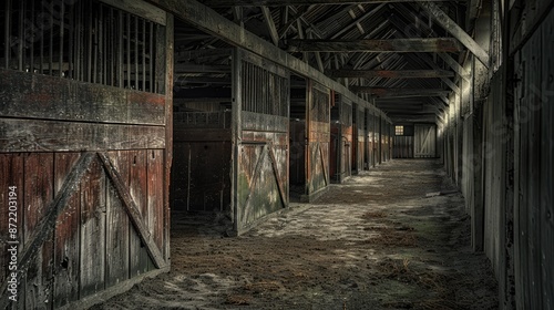 © Roman, Fototapeta premium Empty horse stable, weathered wood. Generative AI