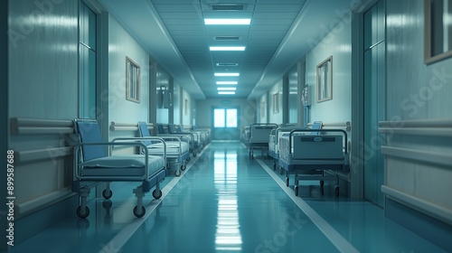 © Katsiaryna, Obraz premium Empty hospital corridor with beds. 3d rendering. Blurred background.