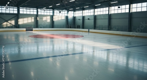 Fototapeta premium Empty ice rink, bright windows at the top, blue lines, a red circle, and...