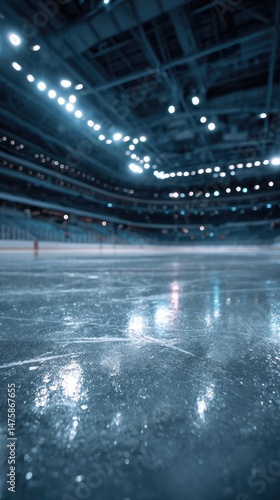 Fototapeta premium Empty ice rink with a smooth surface, viewed from the stands, under soft...