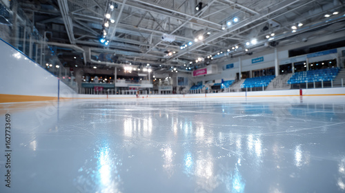 Fototapeta premium Empty indoor ice hockey rink with clear polished surface and bright arena lights, viewed from low angle emphasizing reflections and spaciousness of the venue. Selective focus.