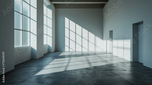 Fototapeta premium Empty industrial room with big windows, white walls and concrete floors with sunlight flowing in