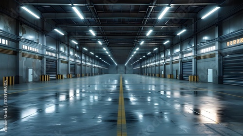 © Almultazam, Obraz premium Empty Industrial Warehouse Interior with Fluorescent Lighting.