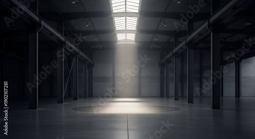 © Eco.71, Naklejka premium Empty industrial warehouse with dramatic light beam spotlight