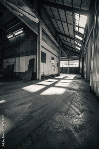 Fototapeta premium Empty industrial warehouse with high ceiling and windows.