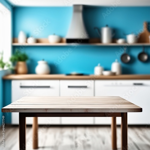 Fototapeta premium Empty kitchen table and blurred kitchen background