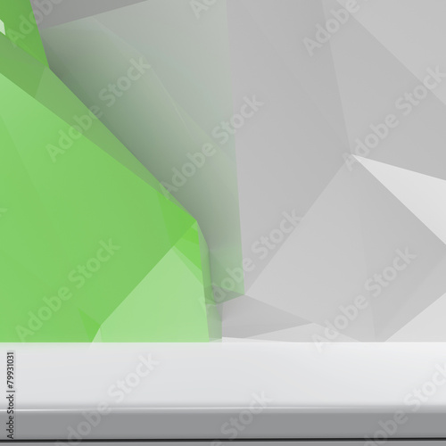 © everythingpossible, Obraz premium Empty laminate shelf on laminate table and low poly geometric ba