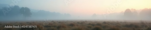 © Janmo, Fototapeta premium Empty landscape with foggy mist rising from the ground, empty, desolate
