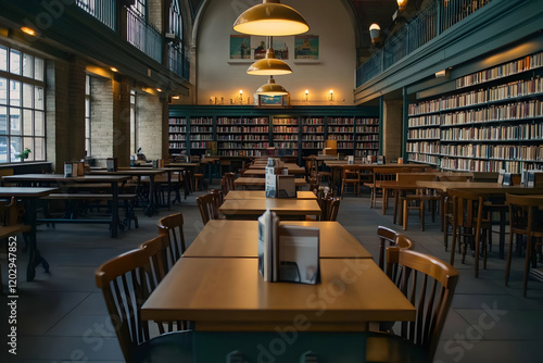 © Siasart Stock, Obraz premium Empty library cafe tables and chairs invitingly arranged amidst bookshelves and soft lighting.