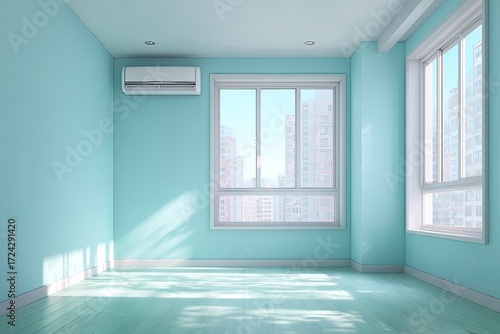 Fototapeta premium Empty light teal room with city view