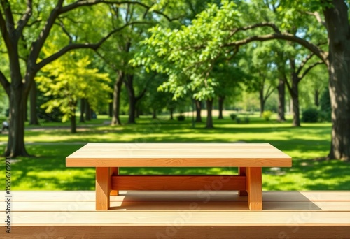 Naklejka premium Empty light wooden table against vibrant green summer park background, ideal for product display, tabletop, surface