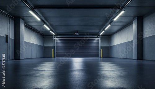 Obraz premium Empty Loading Dock Interior with Closed Shutter Door and Concrete Floor