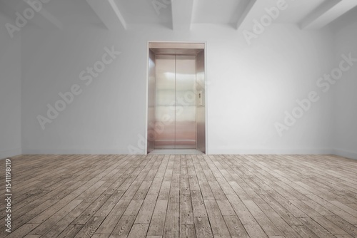 © vectorfusionart, Fototapeta premium Empty lobby is featuring wood flooring and exposed ceiling beams with stainless steel elevator door
