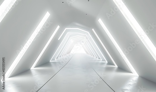 © RidoyDesigns, Obraz premium Empty Long Light Corridor. Modern white background. Futuristic Sci-Fi Triangle Tunnel. 3D Rendering