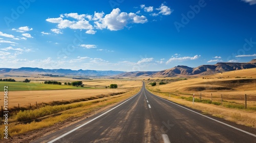 © Vladimir, Fototapeta premium Empty long road. Blue sky and mountains on the background.