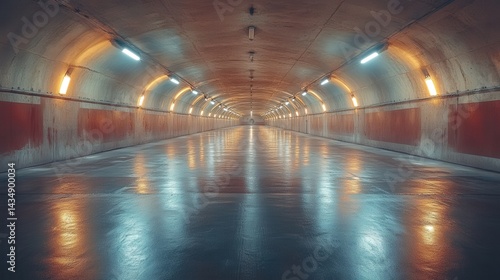 Fototapeta premium Empty, long tunnel's interior, brightly lit and reflecting.