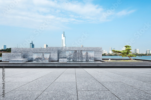 © zhu difeng, Fototapeta premium empty marble floor with decorative waterfall