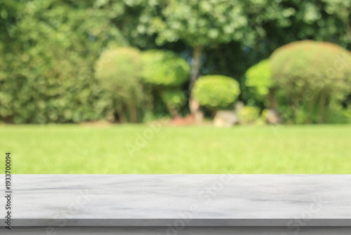 © Kwangmoozaa, Fototapeta premium Empty marble table top with abstract blur green park garden background