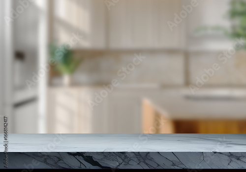 Obraz premium Empty marble top table with blurred kitchen interior Background. for product...