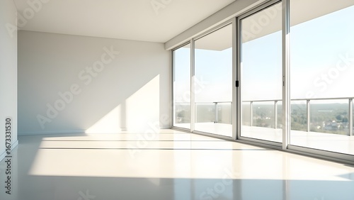 © Stella, Obraz premium Empty modern apartment interior with large glass windows bright sunlight and minimalist contemporary architecture design
