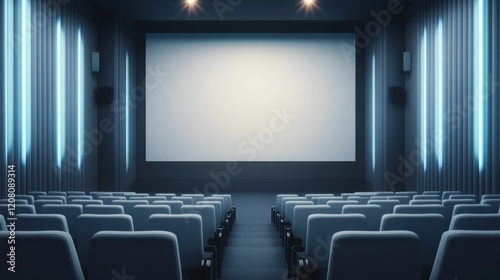 Fototapeta premium Empty modern cinema hall with row of seats and large screen for movie experience
