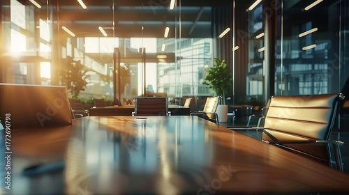 © Gophotograph, Fototapeta premium Empty modern conference room with long wooden table and leather chairs in sunlight interior view