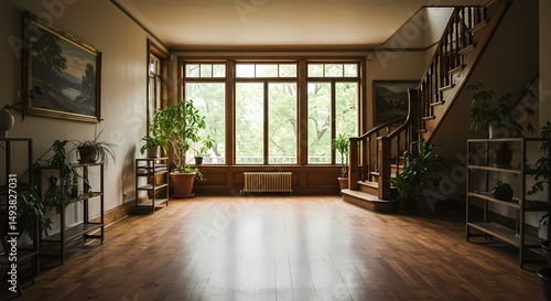 Obraz premium Empty modern office interior boasts new parquet floors, large windows offering an open view, and a spacious design within the building's architecture