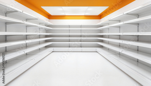 © Andrey, Fototapeta premium Empty modern retail shelves against an orange ceiling