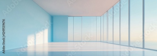 © Putra, Fototapeta premium Empty modern room with large windows and sunrise view.