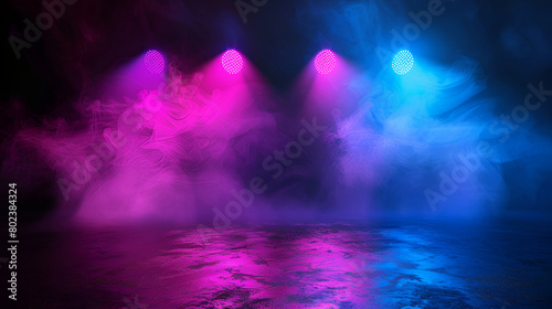 Fototapeta premium Empty modern stage with bright background for performance, stage lighting with spotlights for dance performance ,Abstract with coloured smoke on black background