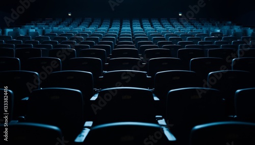 © sangkribo, Fototapeta premium Empty movie theater auditorium. Rows of dark blue seats stretch into the distance. Dim lighting creates a sense of anticipation