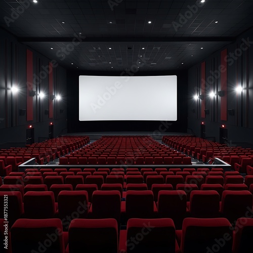 Obraz premium Empty Movie Theater - Rows of Red Seats Facing a Large White Screen.