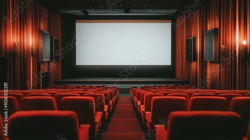 Fototapeta premium Empty movie theater with red seats and a large blank screen, ready for the show.
