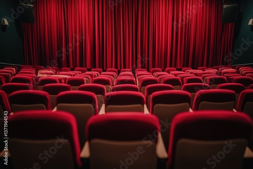 © Drapix, Fototapeta premium Empty movie theater with red seats and curtains, creating a classic cinema atmosphere.