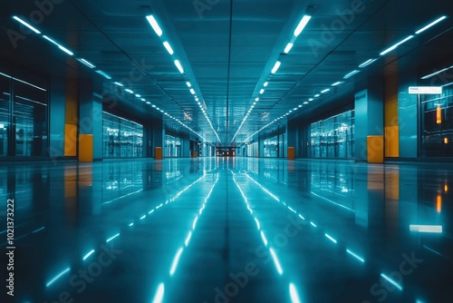 Fototapeta premium Empty, Neon-Lit Corridor in Modern Building