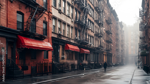 © ZenArt, Fototapeta premium Empty New York City street at dawn with Victorian figure.