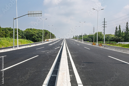© zhao dongfang, Fototapeta premium Empty newly paved asphalt road stretching into the distance under a clear sky.