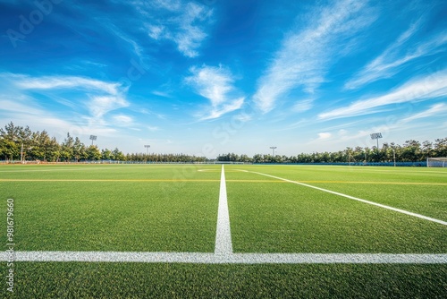 © Dzikrul Husnani, Obraz premium Empty nobody soccer stadium field with blue sky, soccer background, ai